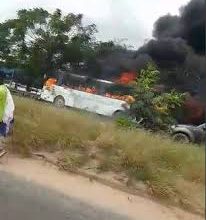 WESLEY GRAMMAR SCHOOL BUS CARRING 88 PASSENGERS CATCHES FIRE AT KASOA TOLLBOOTH