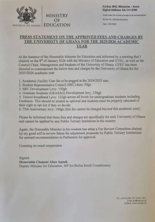 The Ghana Tertiary Education Commission (GTEC) has officially approved the University of Ghana’s fee structure for the 2025/2026 academic year, confirming no increase in the Academic Facility User Fee while introducing a one-off 75th Anniversary Levy.